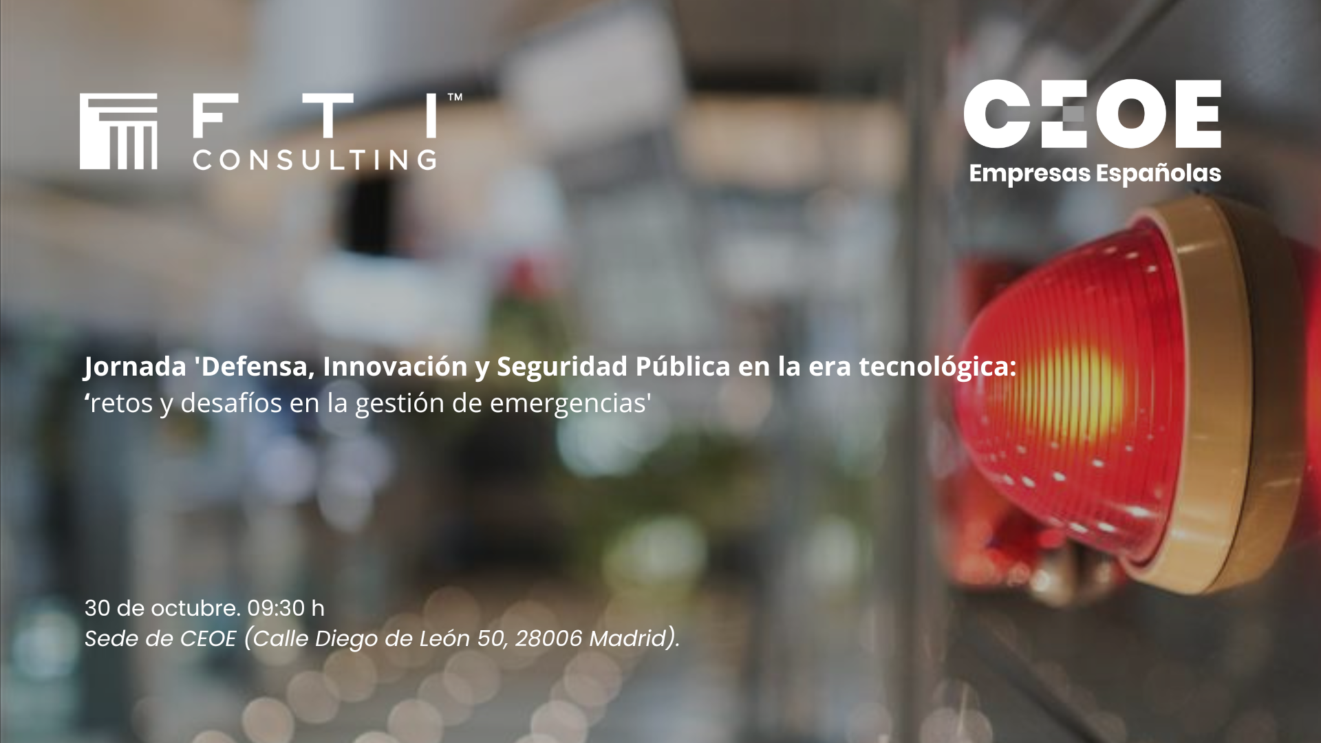 CEOE y FTI Consulting tienen el placer de invitarle a la jornada Defensa, Innovación y Seguridad Pública en la era tecnológica: retos y desafíos en la gestión de emergencias que se celebrará el próximo 30 de octubre a las 09h30 en la sede de CEOE (Calle Diego de León, 50 – Madrid).