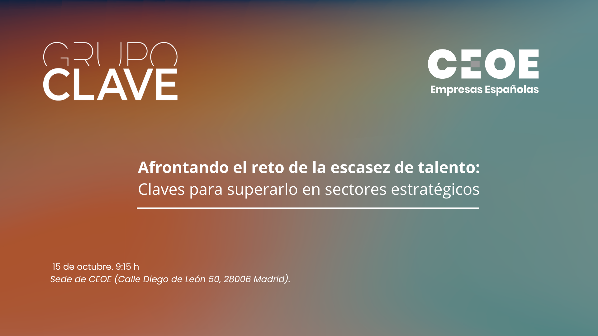 Desde CEOE y Grupo Clave te invitamos a la jornada ‘Afrontando el reto de la escasez de talento: claves para superarlo en sectores estratégicos’ el próximo 15 de octubre a las 09:15h.
